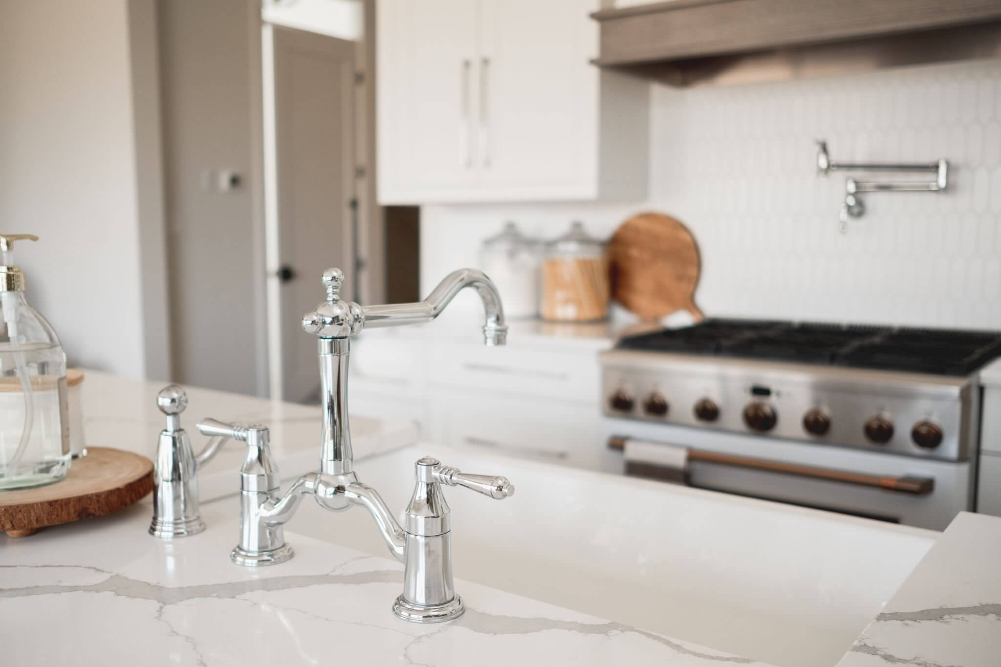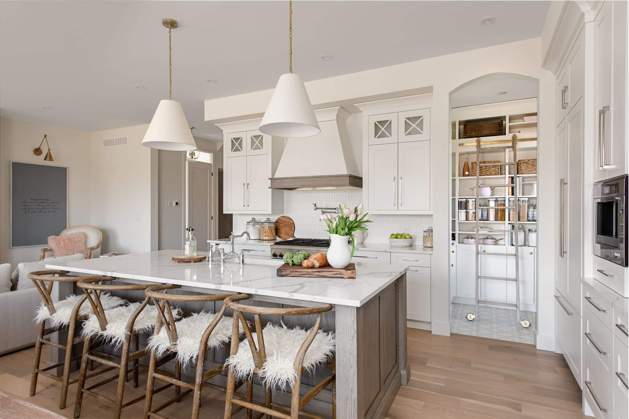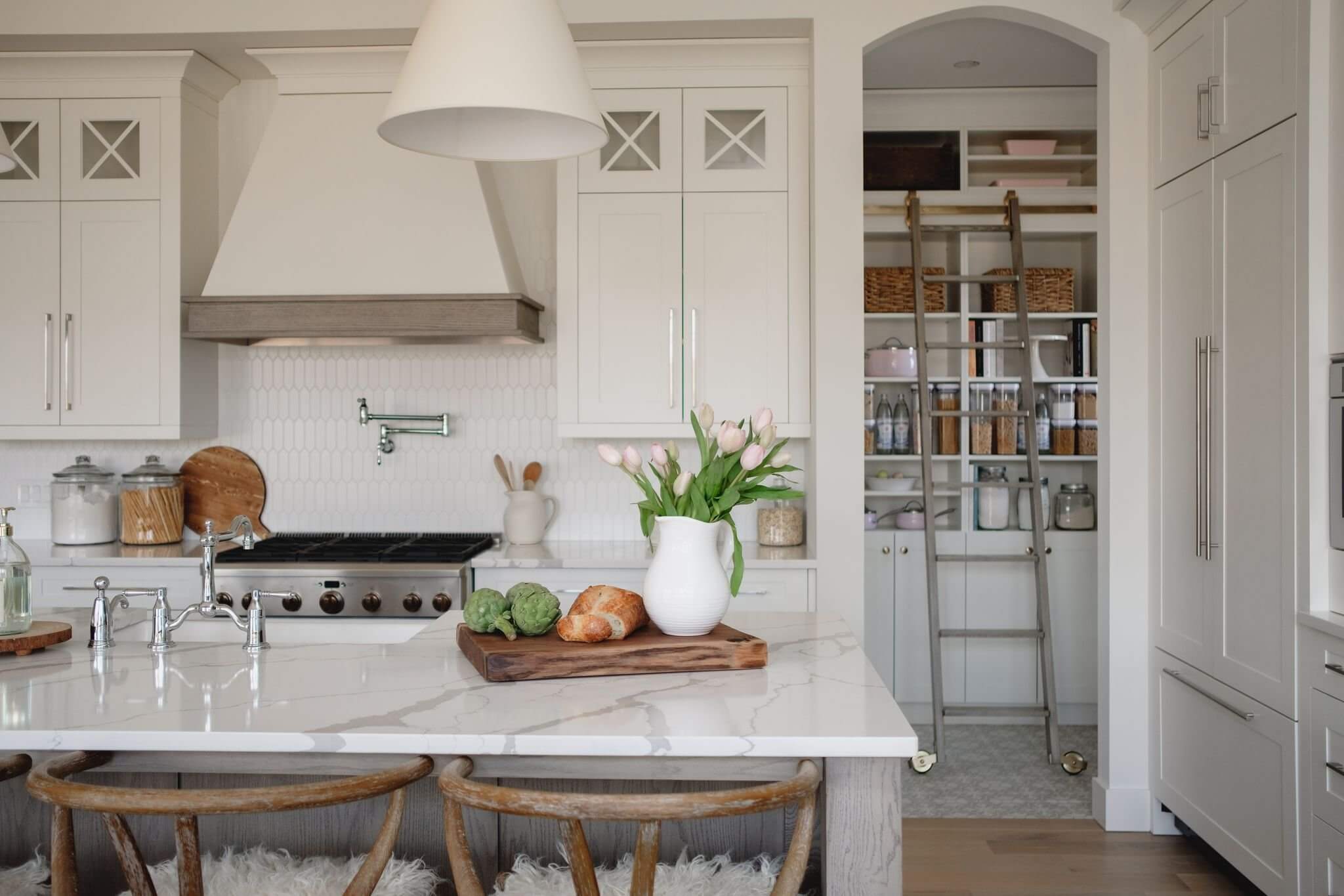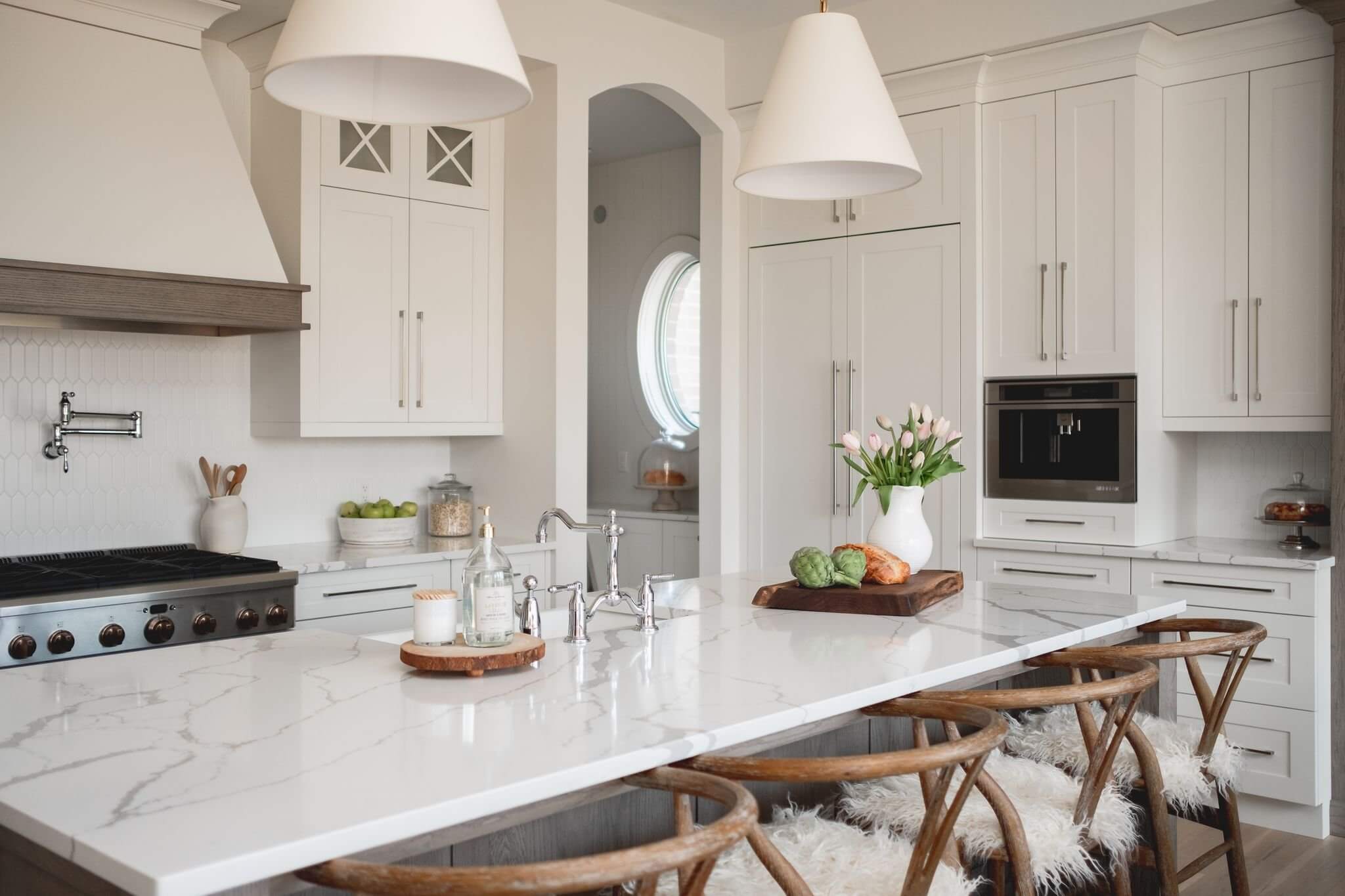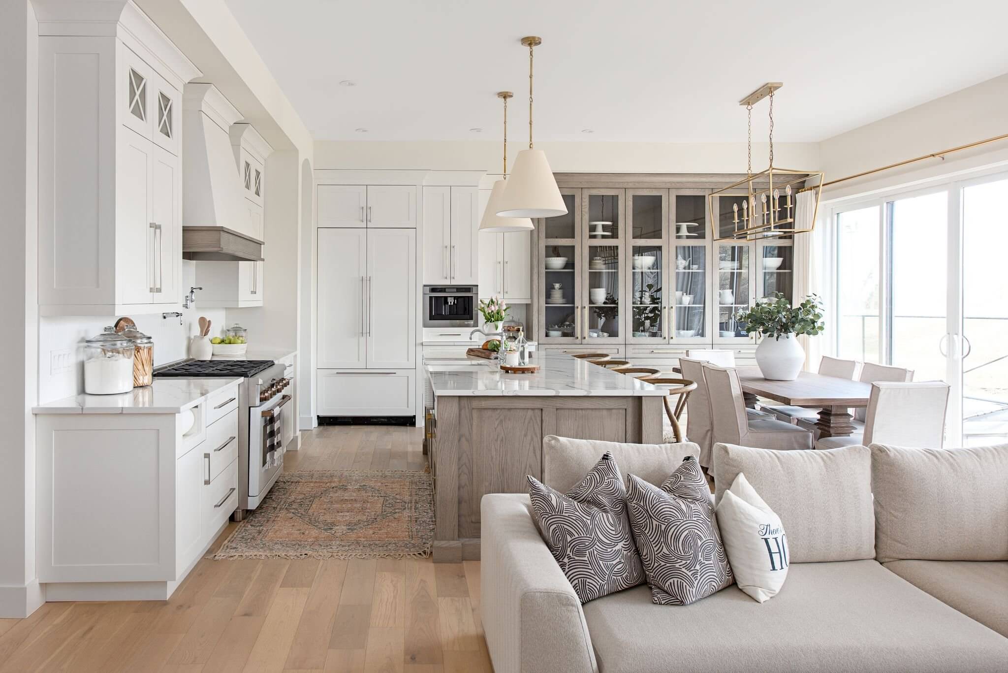 A mix of neutral colours, natural textures and decorative accents come together to create a modern take on the classic farmhouse look. Thoughtful material and finish selection create a timeless kitchen that exudes liveable luxury.
