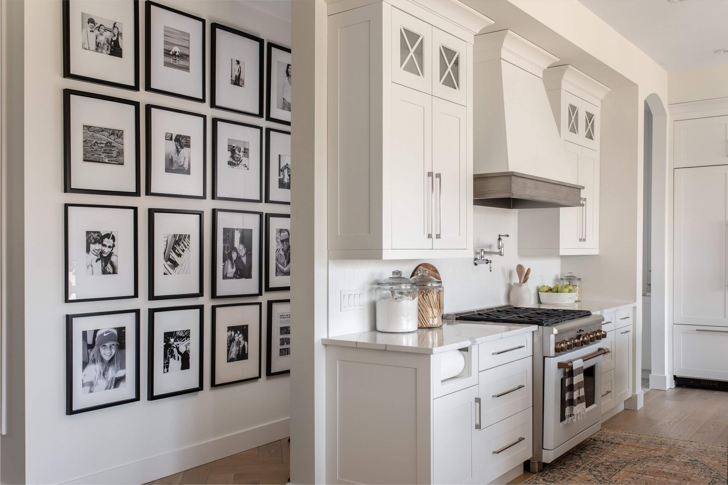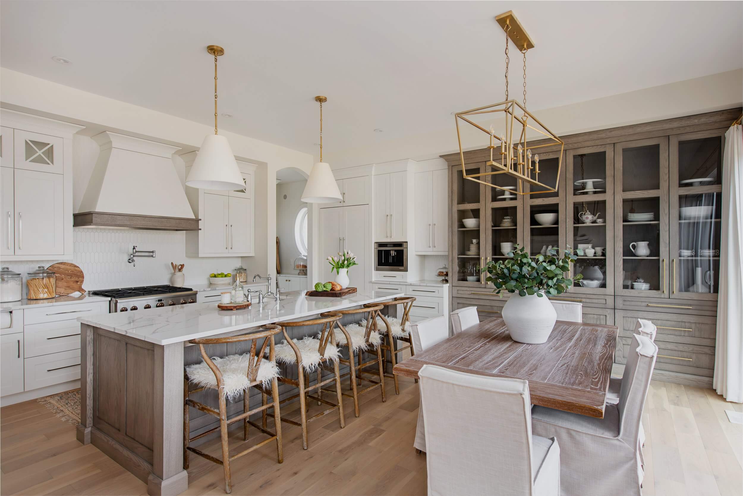 Muted white cabinetry is contrasted by traditional oak, softened by a modern gray stain. The impressive hutch is a statement piece, displaying an eclectic mix of décor that balances the wall of cabinetry. Rustic bar stools with shag cushions add a hint of Parisian chic. Brushed gold accents mixed with stainless steel blend both classic and trendy. A contemporary apron sink, farmhouse faucet and quartz countertops complete the modern French Country look.