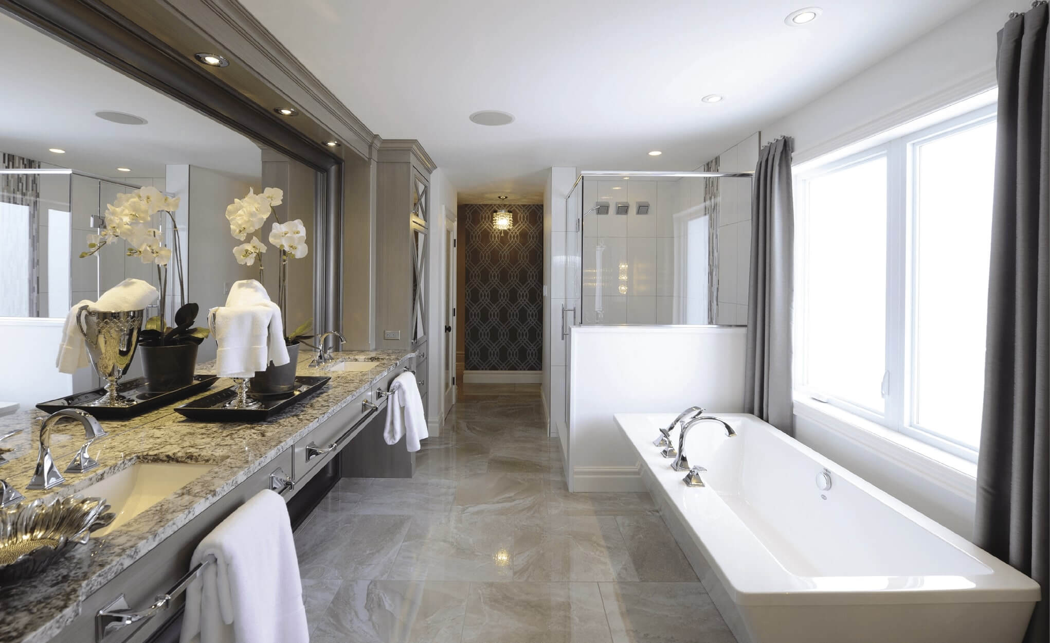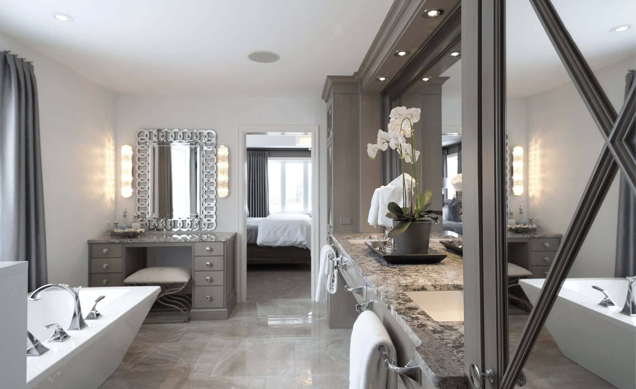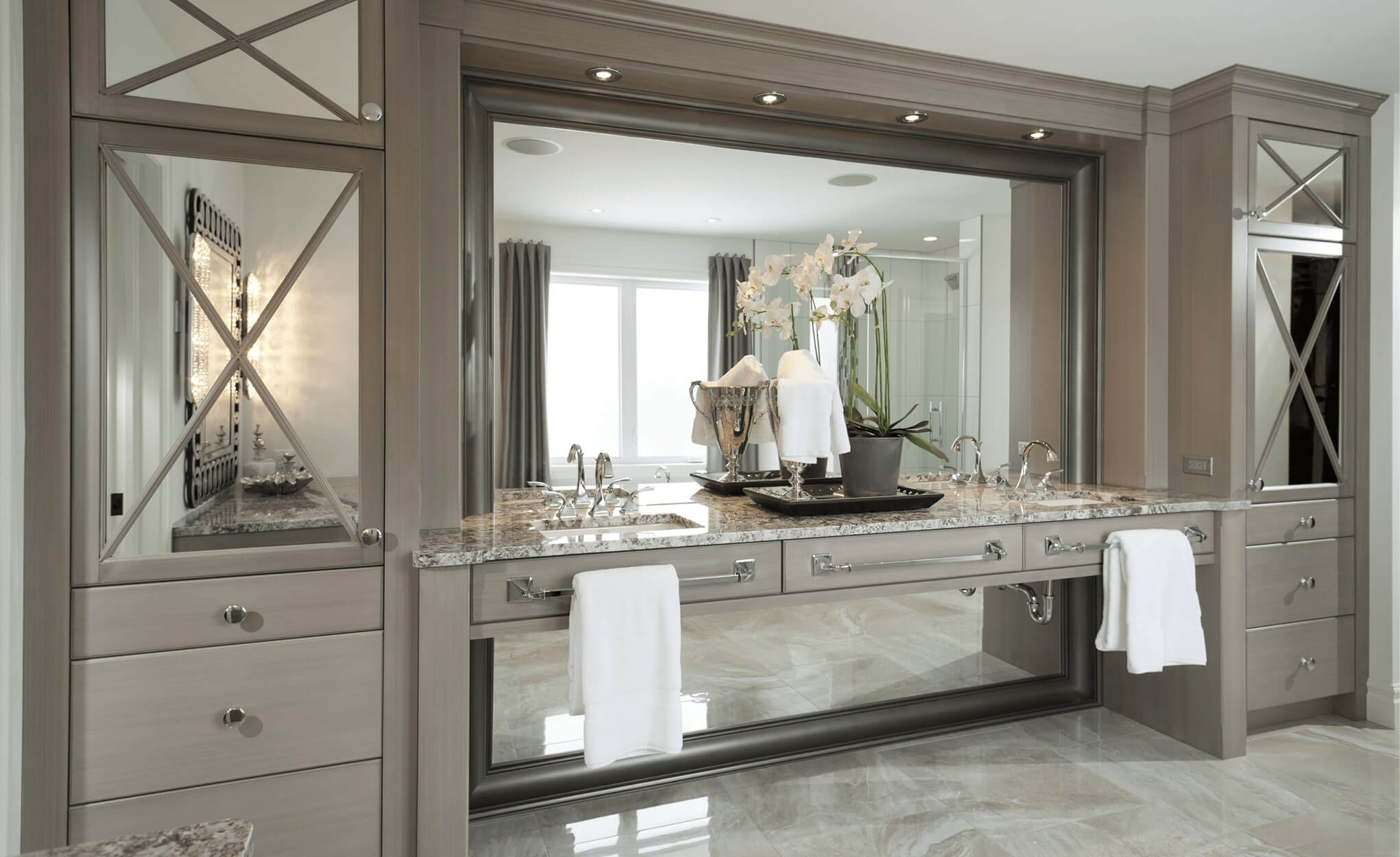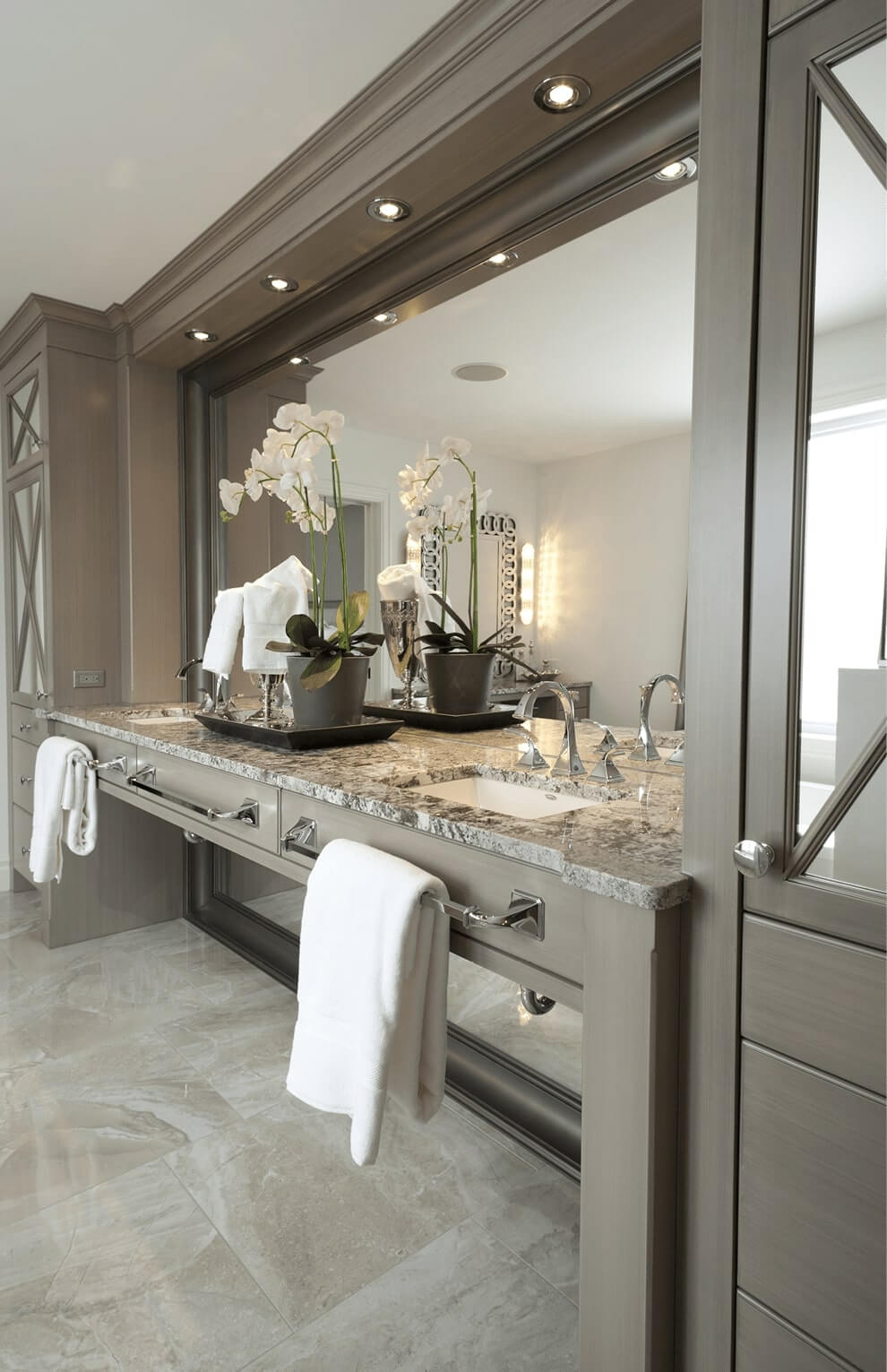 This elegant bathroom is a true beauty. From the custom details in the cabinetry, to the cleverly hidden storage spaces, this bathroom combines function and style in a design that definitely stands the test of time.