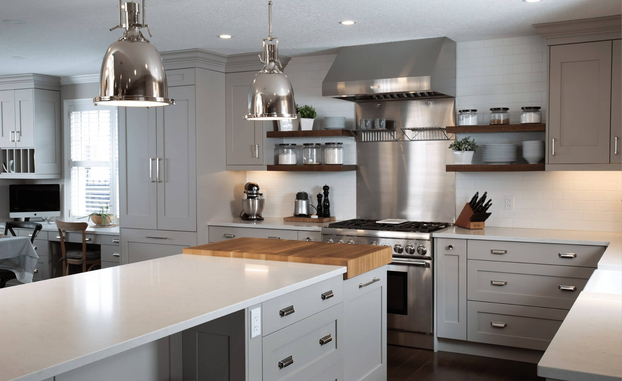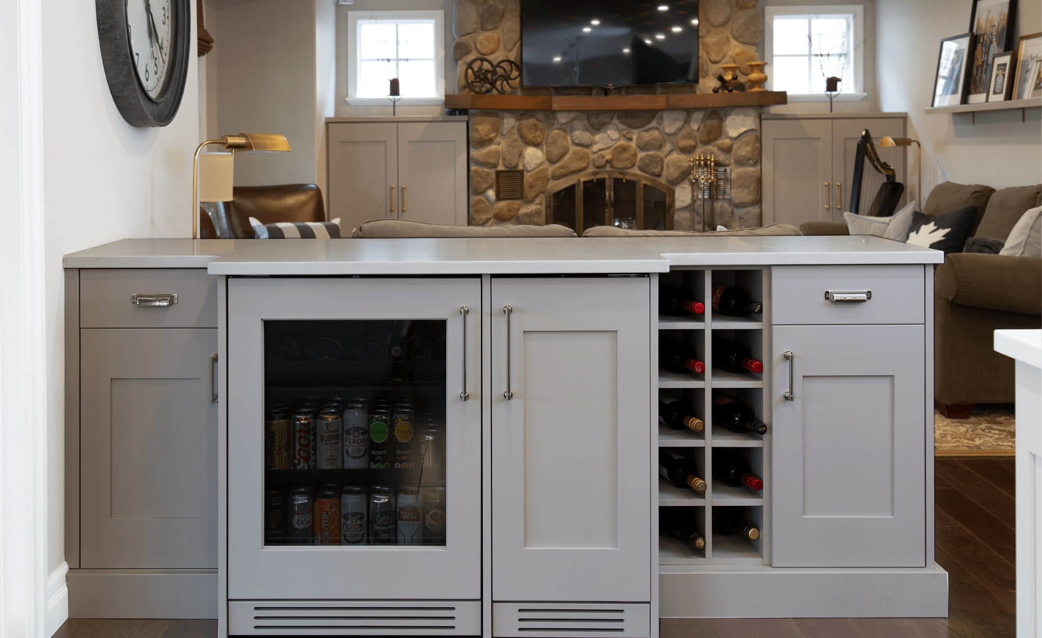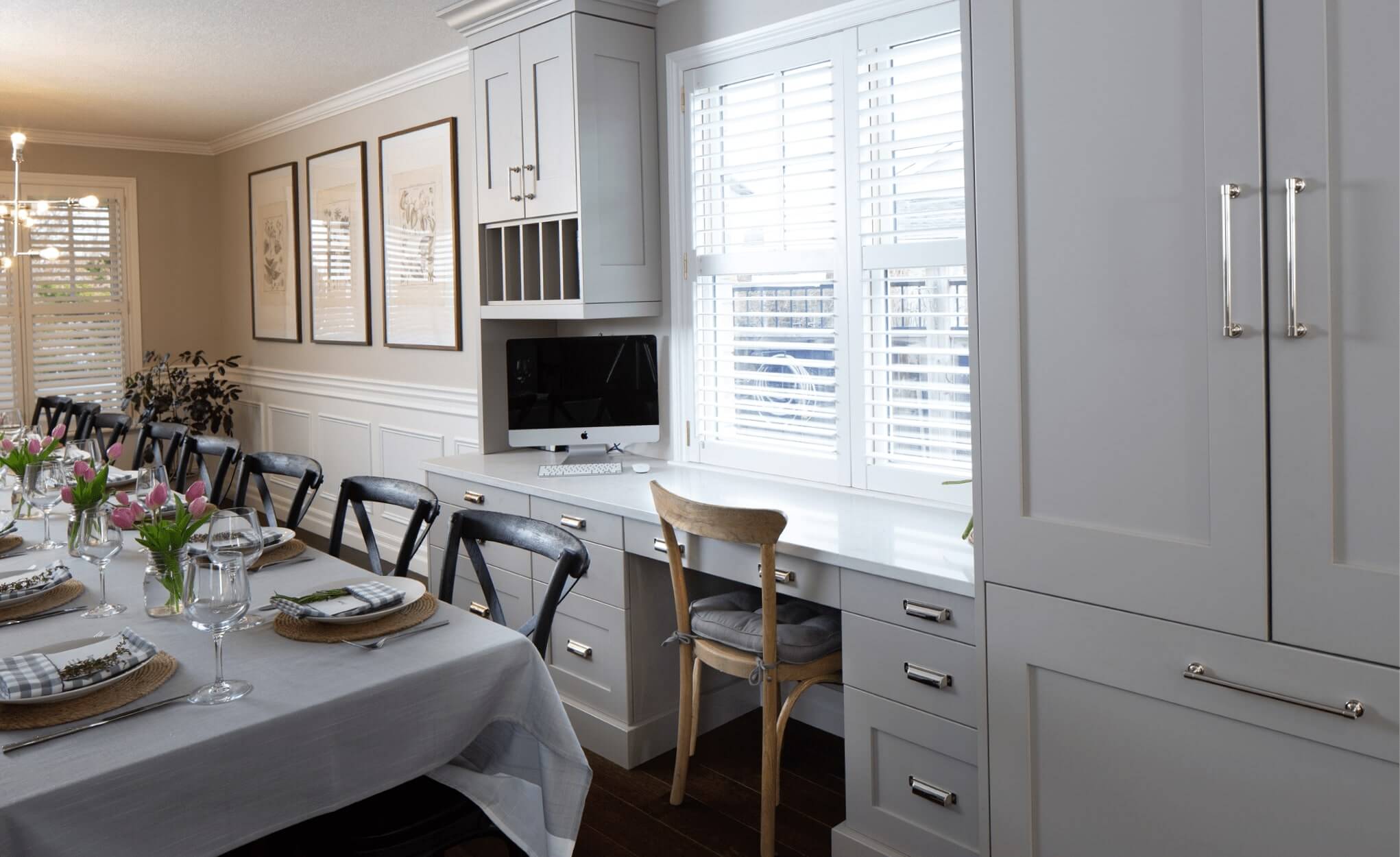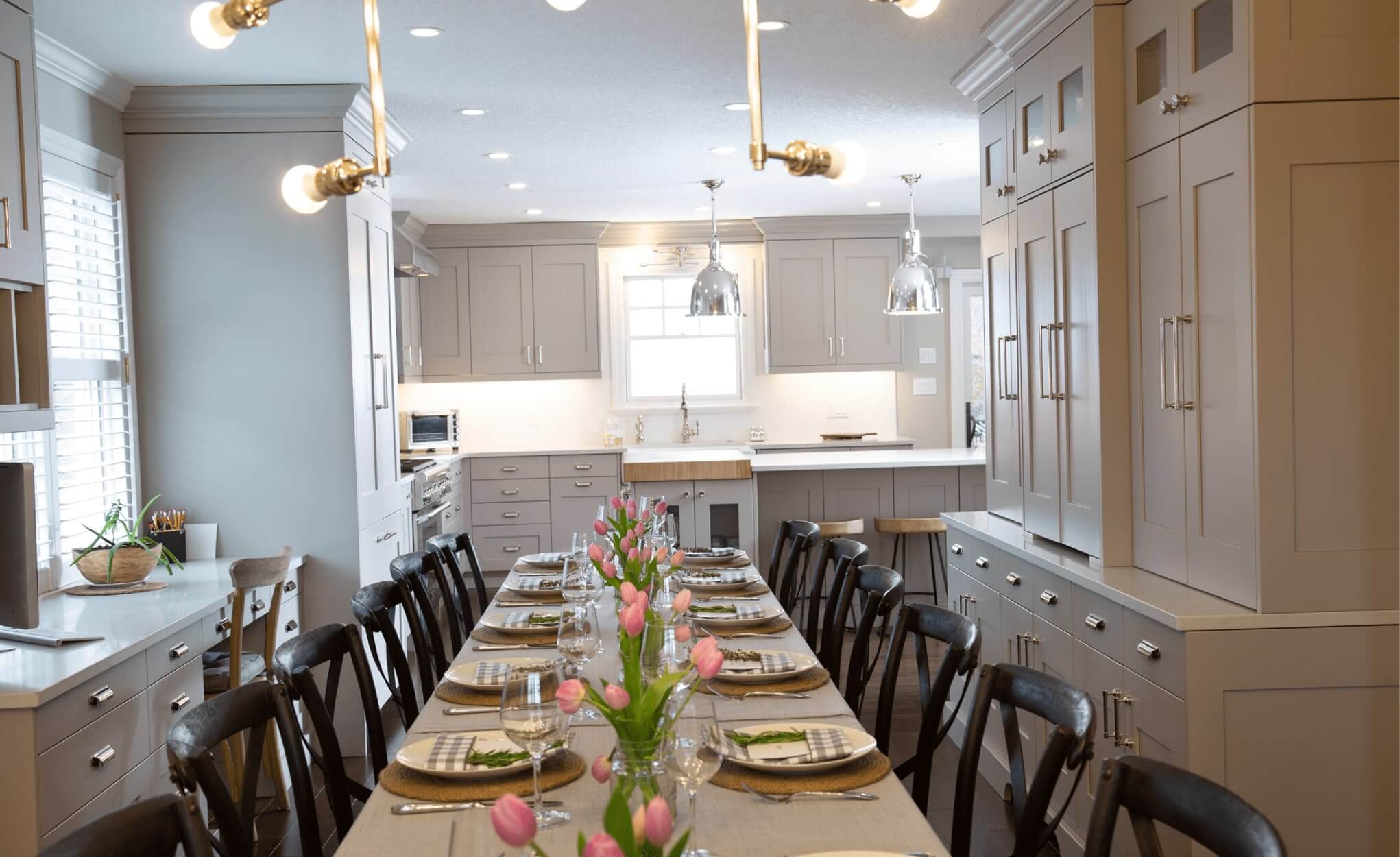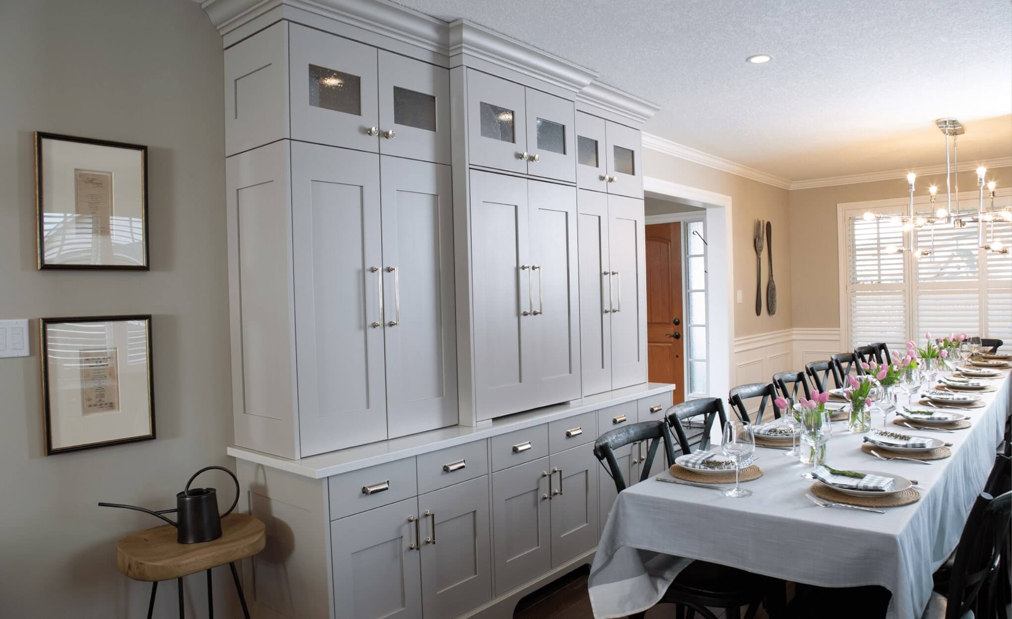 A traditional, choppy main floor layout was re-designed to produce one cohesive space for this client who loves to host weekly dinners for their large extended family. Additional seating, task-oriented cooking zones and entertaining pieces like the custom buffet and beverage centre, were the focus of this #restorationhardware inspired kitchen design in Waterloo, Ontario.