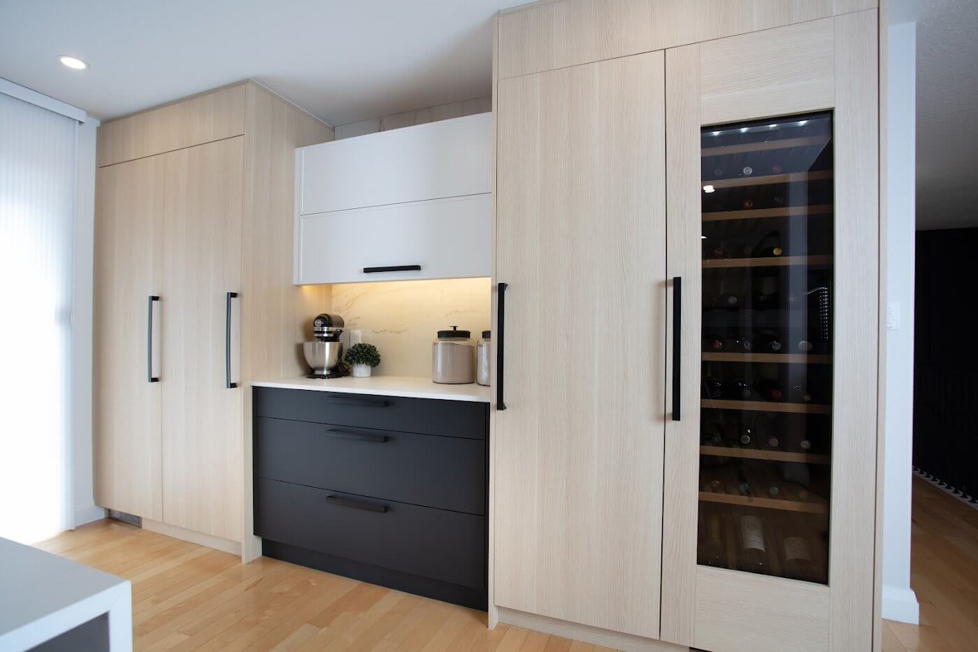 Transitioning a traditional home to a modern, contemporary style is never an easy feat, but this renovated bungalow in Lakeshore North managed this task with perfection! Both bold and dramatic, this kitchen is built to entertain. Warm wood tones soften the black and white colour palette. The design incorporates flexible lighting options to counter the windows facing all orientations. A dedicated smoothie area complements this young couple’s active lifestyle, while their shared passion for cooking meant top-end appliances were a must-have feature of the kitchen design. This space is now the perfect place for their love of wine, food, and music to be shared with family and friends.