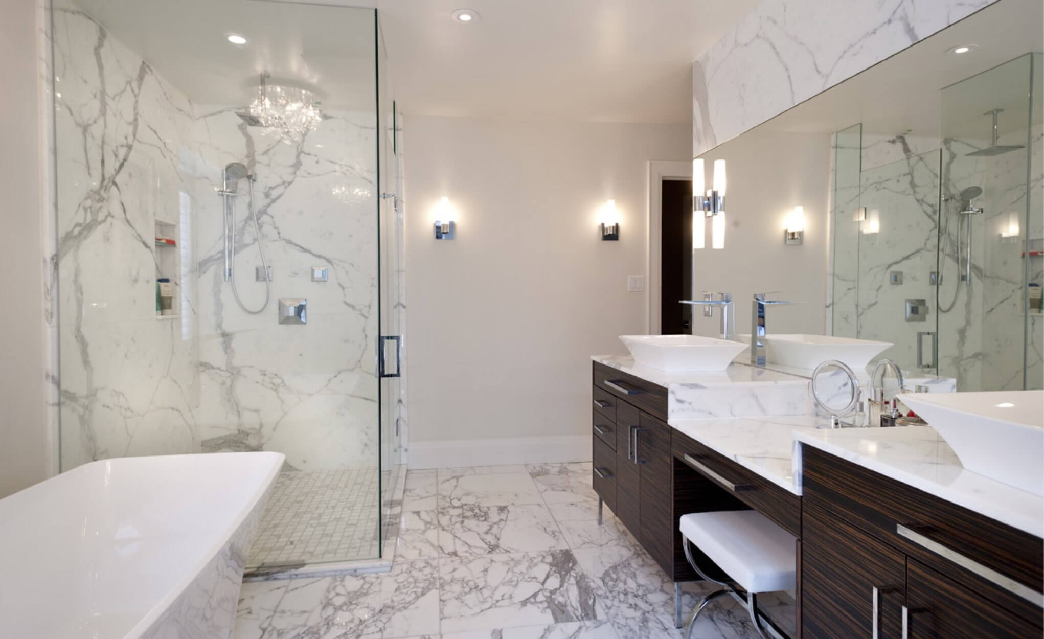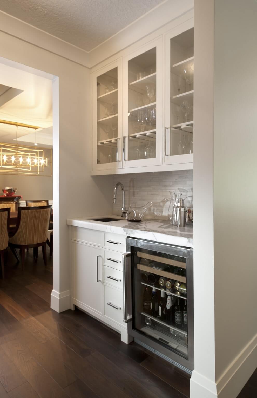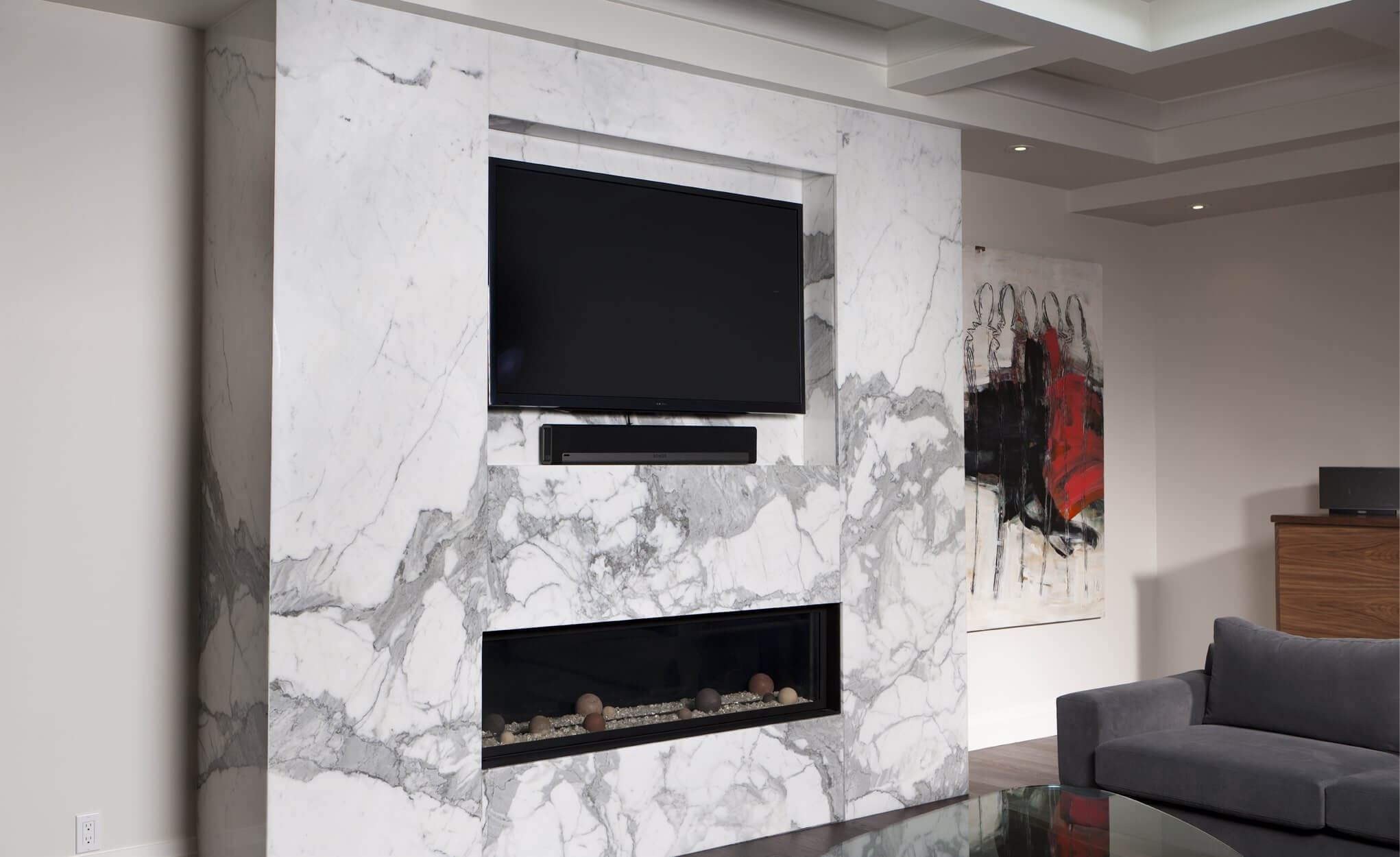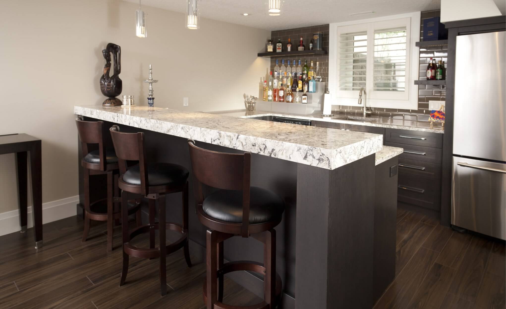 One of our favourite projects, this full home renovation was an extraordinary transformation to watch! From the elegant ensuite to the kid-friendly mudroom to the trendy basement bar, this home is full of style and class. We are particularly fond of the marble surround on the fireplace, fabricated and installed by Casey’s Stone Division. The natural veining is like a stunning piece of art!