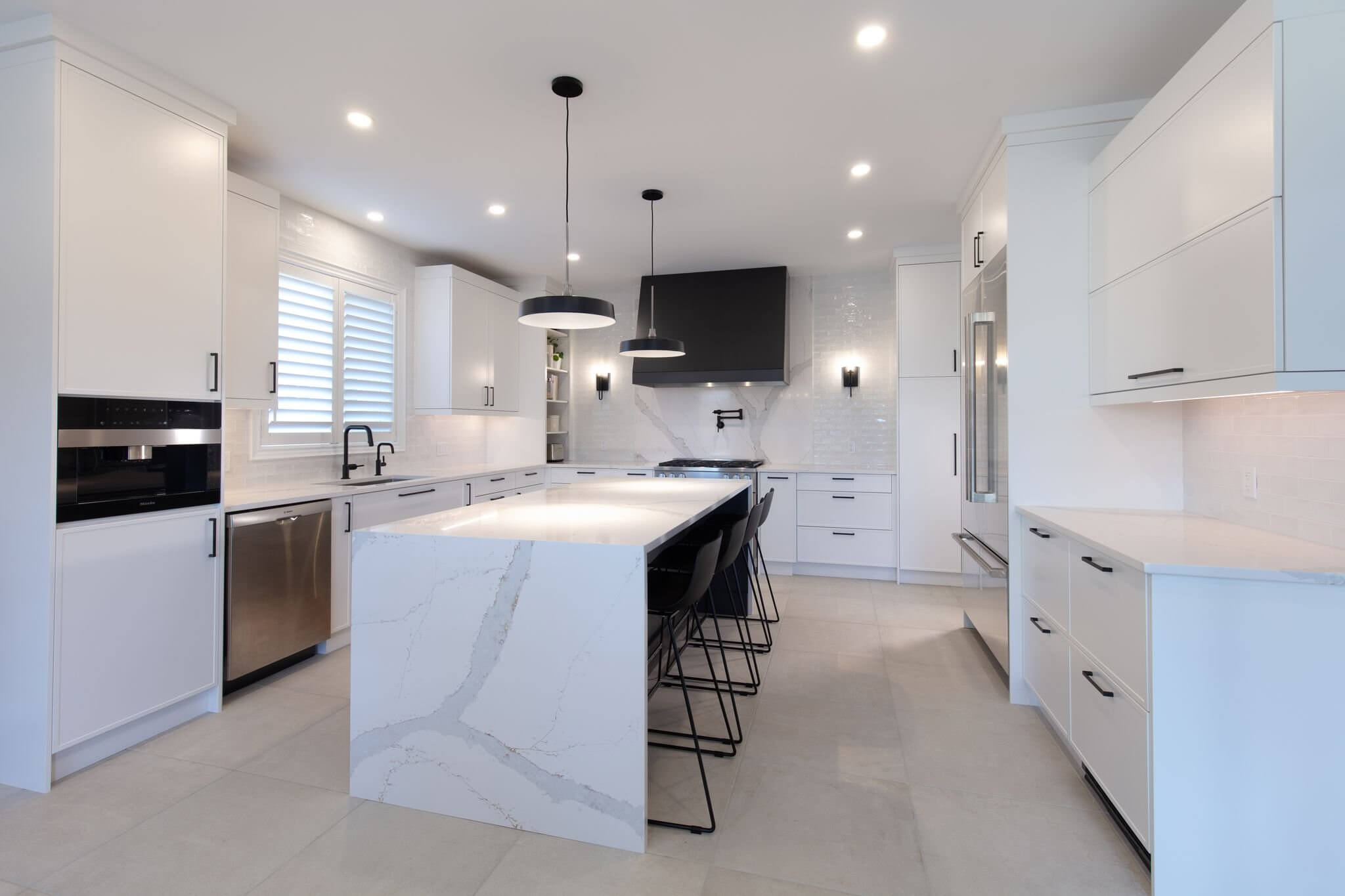 With particular attention to symmetry and balance, everything had to be aligned properly and designed with a purpose. The style goals were modern, crisp, fresh and dramatic. With out-of-the-box thinking, we were able to reimagine this cluttered space by improving the workflow, traffic zones and overall feeling in the family’s favourite room in the home.