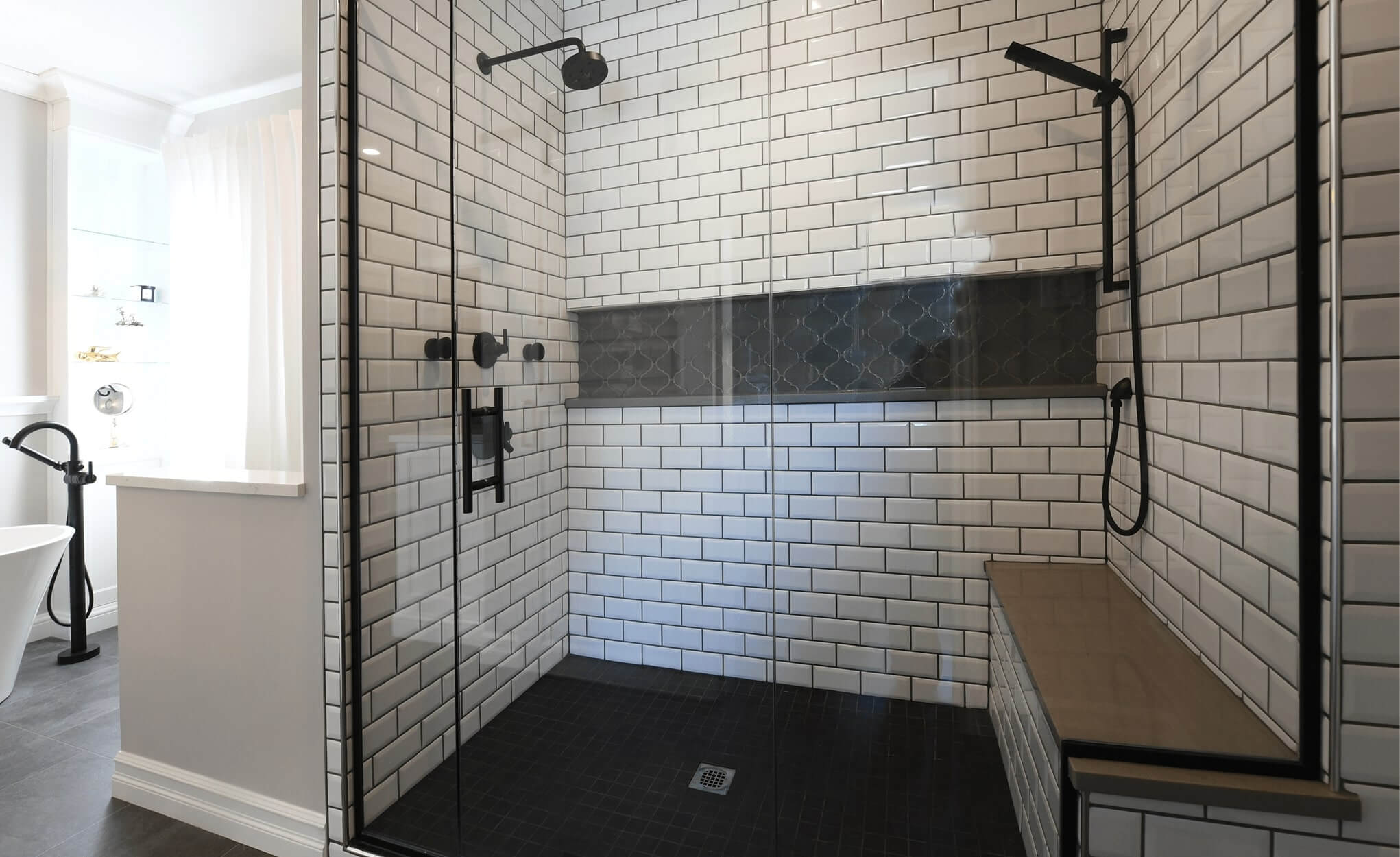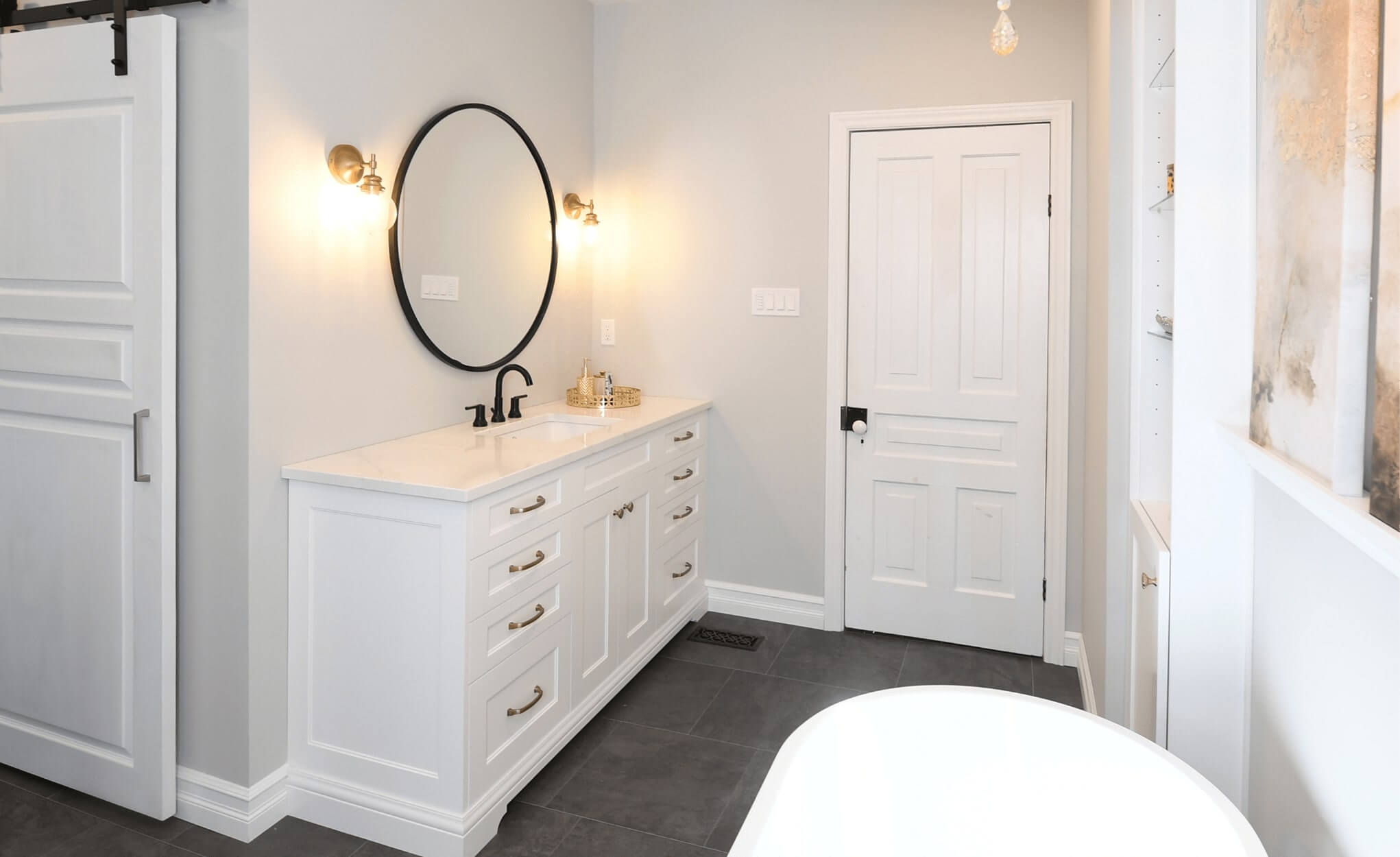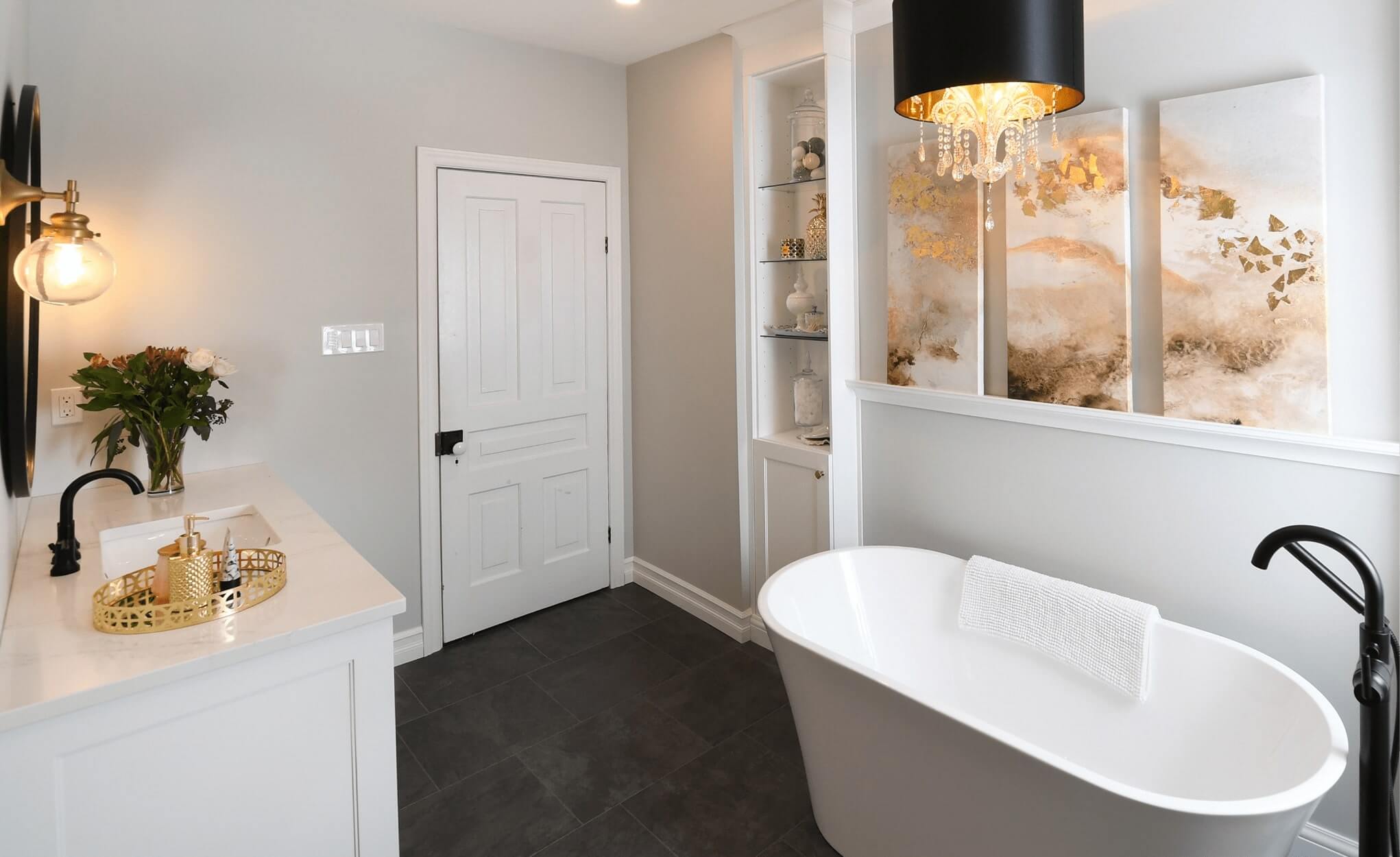 The day’s stress will melt away surrounded by luxury in this glamorous bathroom. With its modern mix of black and gold elements, dramatic lighting and sophisticated charm, this elegant space is designed to elevate the relaxation experience.