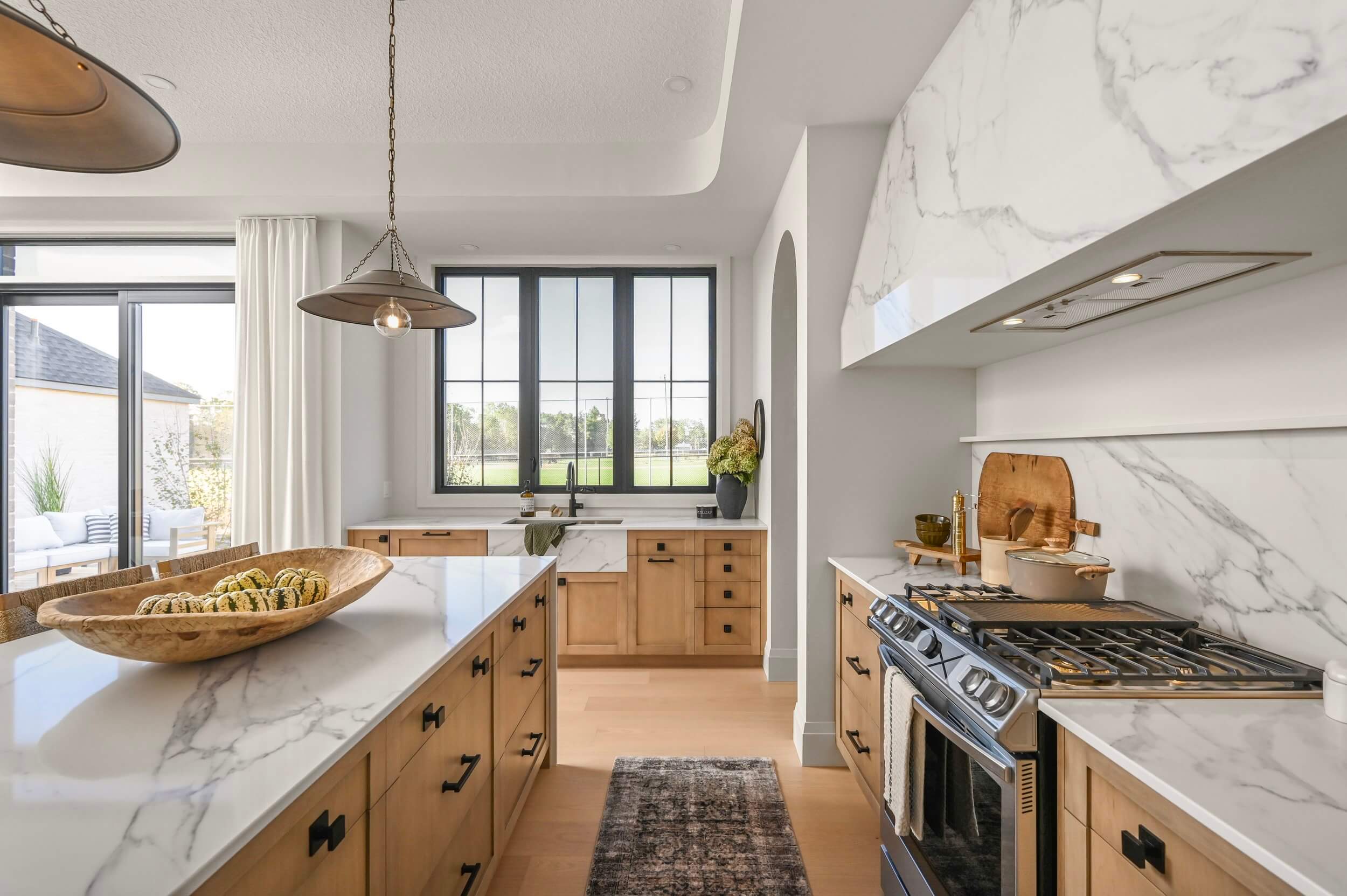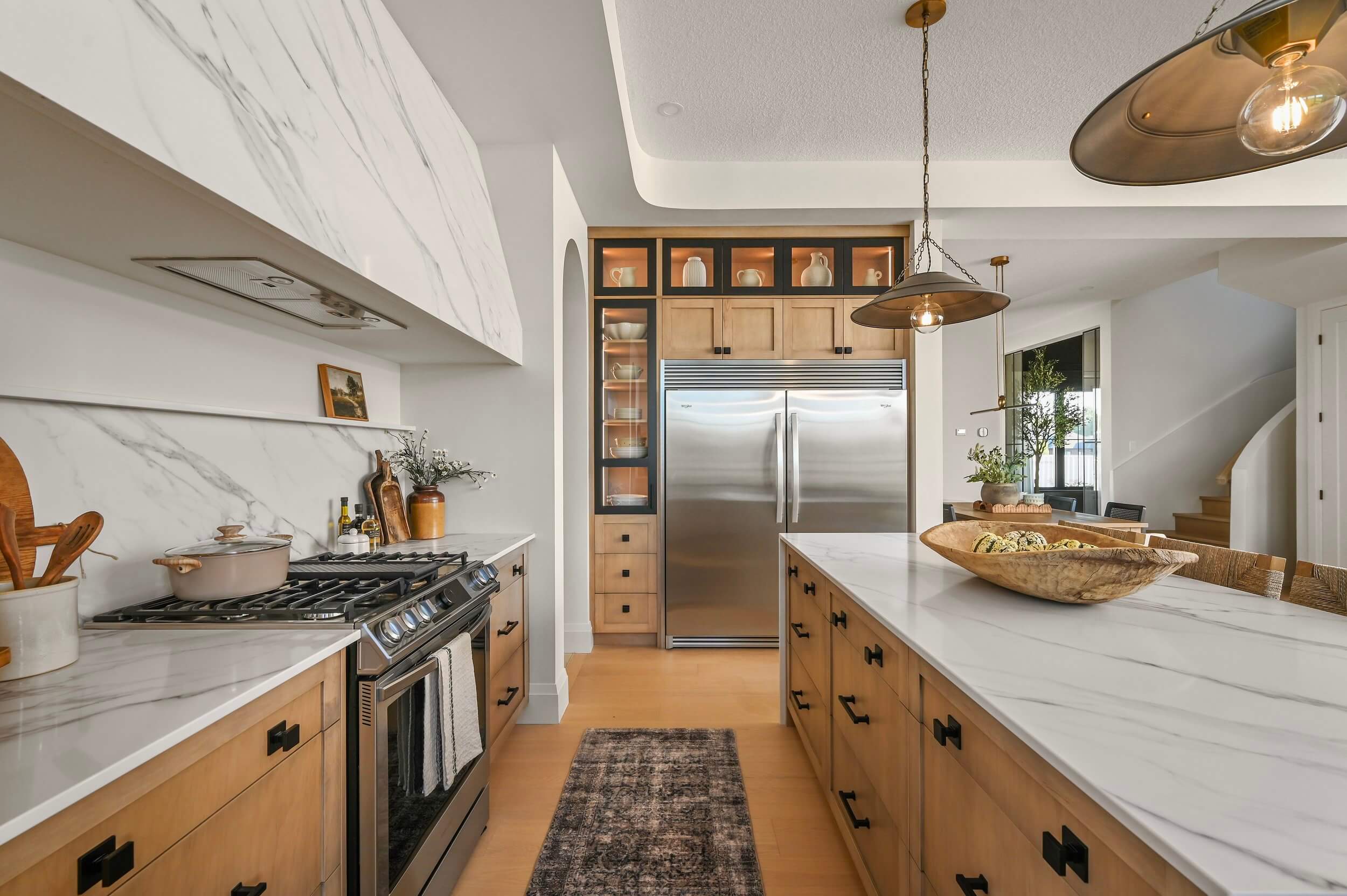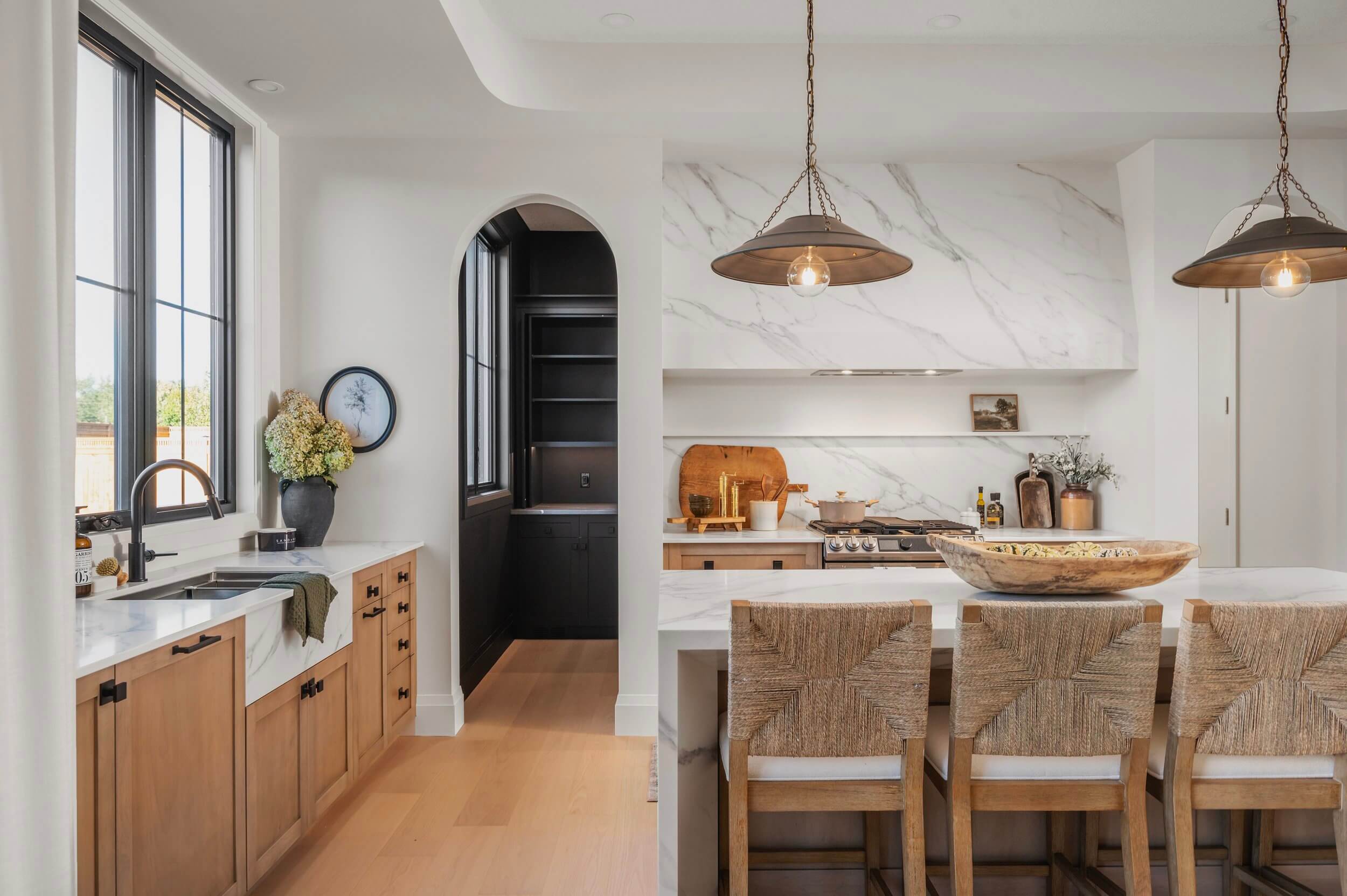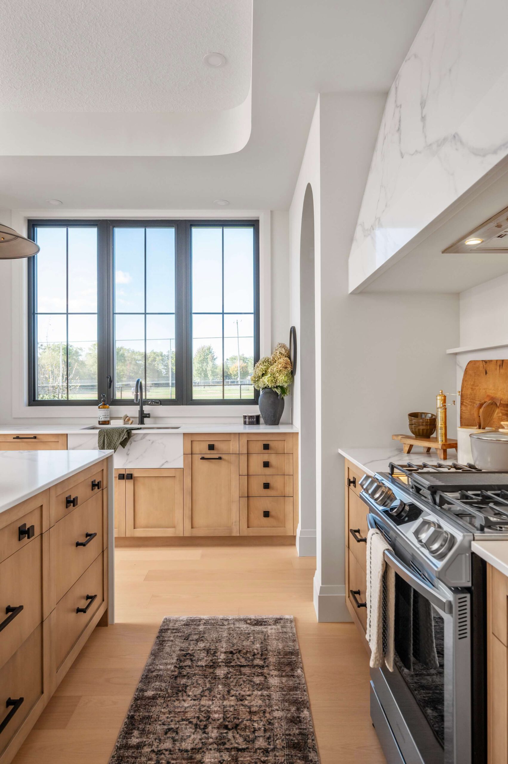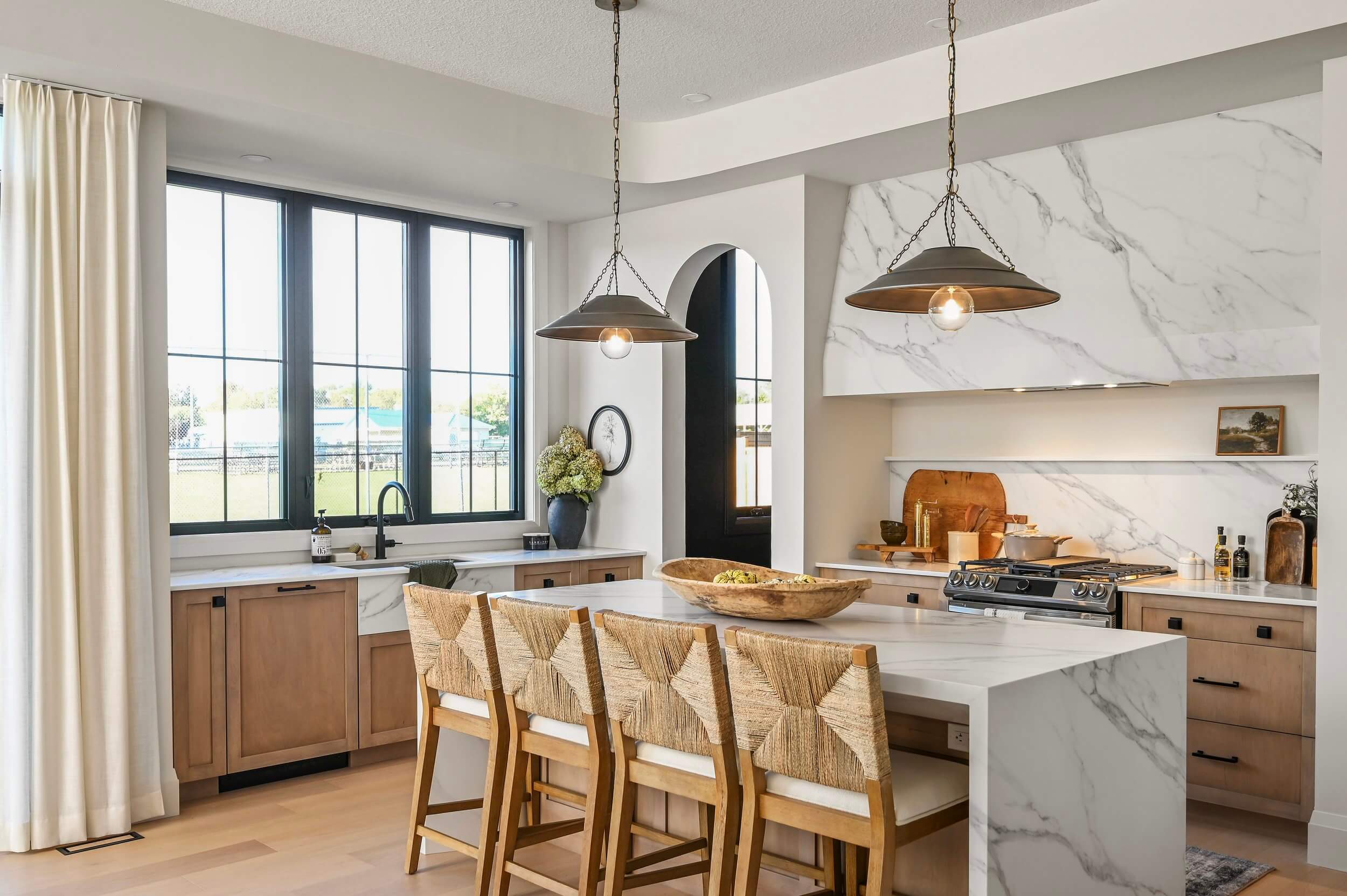 The 2024 Lottery Dream Home in Thorndale, Ontario blends modern luxury with rustic warmth. Light wood cabinets, Quartz countertops, and open walk-in-pantry create an inviting, airy space, while the large island with woven barstools offers a perfect spot for gathering. Black-framed windows allow abundant natural light, enhancing the clean and sophisticated design. Industrial pendant lights and large black hardware add a chic, contemporary touch. Clean glass and metal doors surrounding the refrigerator add both functionality and aesthetic appeal, making the space feel both elegant and welcoming.